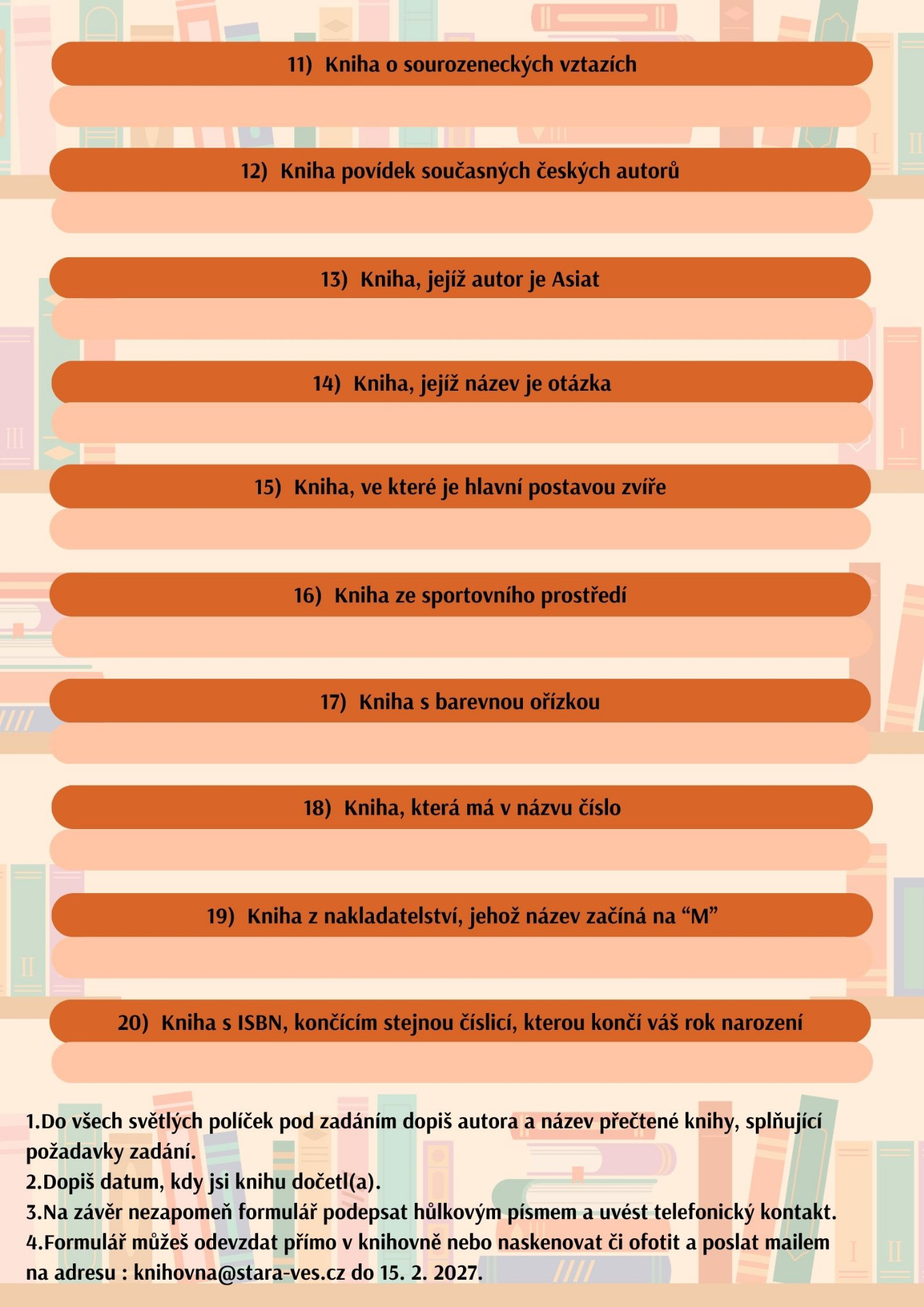 Formulář si stáhněte a vytiskněte nebo vyzvedněte v knihovně a můžete začít. Vyplněný pošlete e-mailem na adresu knihovna@stara-ves.cz nebo odevzdejte v knihovně do 15. 2. 2027.