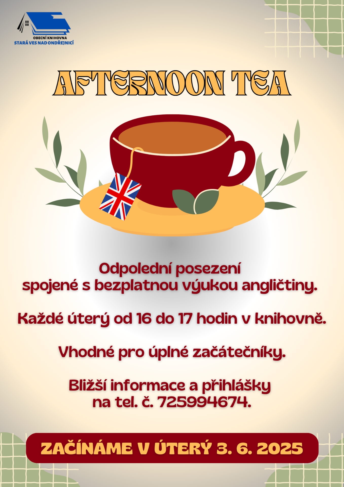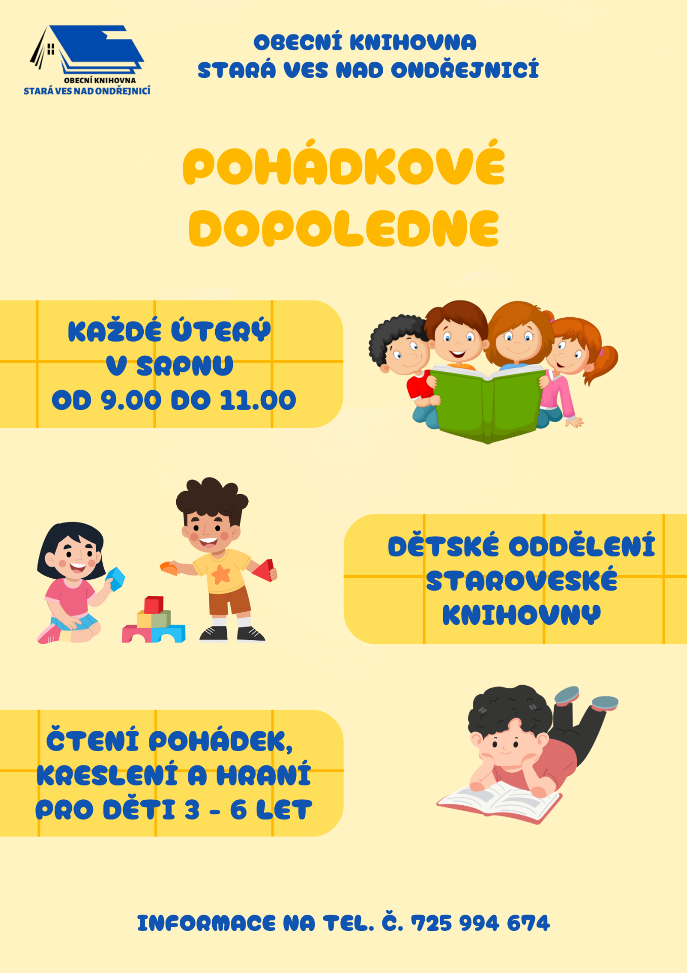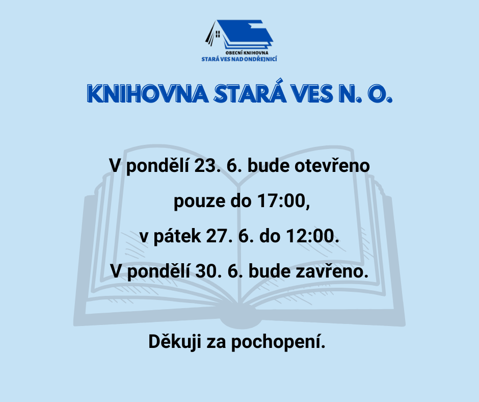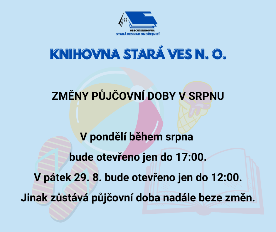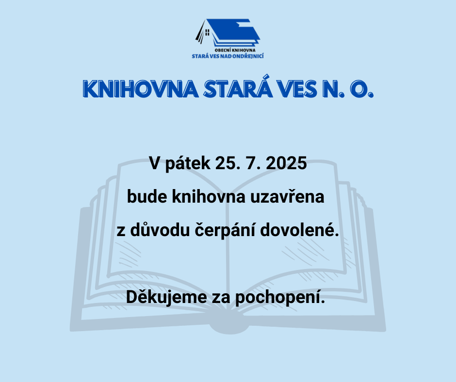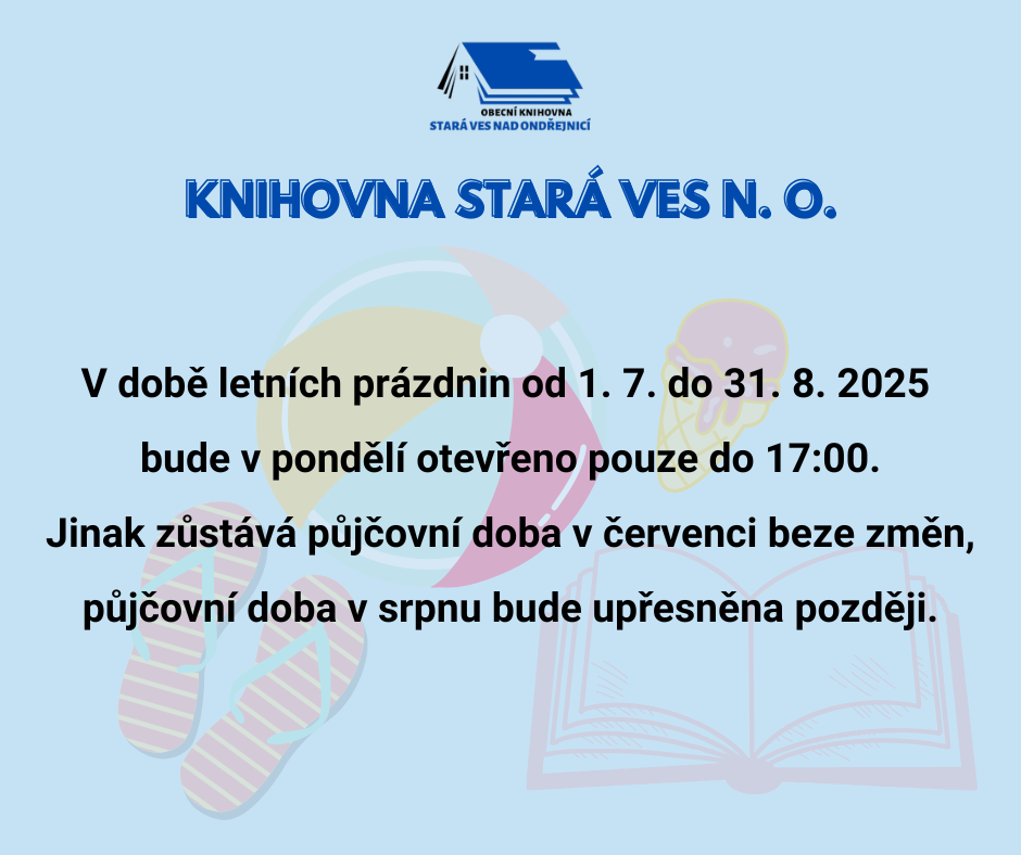 Obecní knihovna Stará Ves nad Ondřejnicí zve všechny, kdo rádi čtou, na pravidelné povídání o knihách a čtení, které se koná každé první úterý v měsíci. V červenci se opět uvidíme 2. 7. v 15:00.