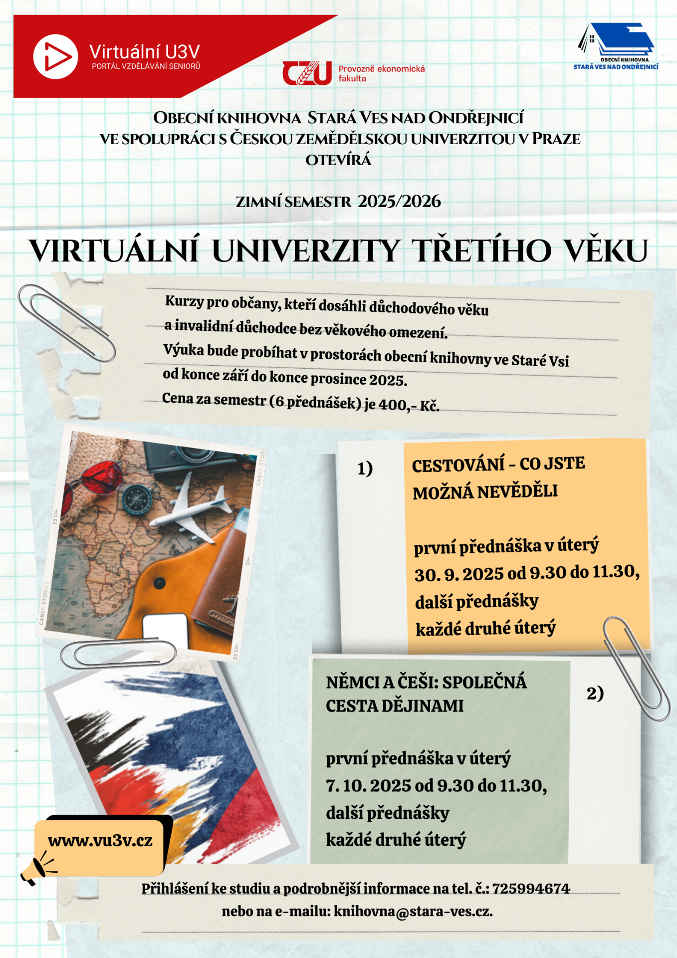 Obecní knihovna Stará Ves nad Ondřejnicí ve spolupráci s Českou zemědělskou univerzitou v Praze otevírá zimní semestr 2023/2024 VU3V (Virtuální univerzity třetího věku).