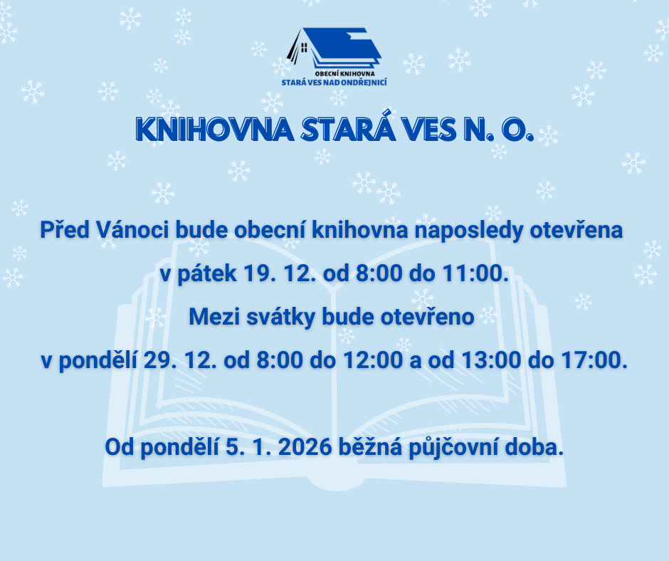 Mezi svátky si můžete vypůjčit knihy v pondělí 29. 12. od 8 do 12 hodin a od 13 do 17 hodin.